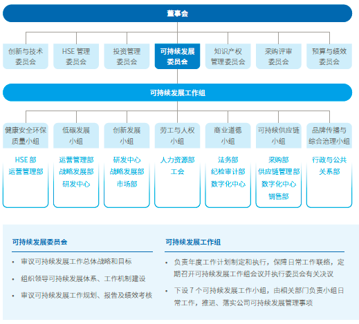 可持續(xù)發(fā)展委員會作為公司可持續(xù)發(fā)展工作主要責任機構(gòu),主席由公司首席執(zhí)行官擔任,委員包括首席運營官及副總裁。委員會下設(shè)可持續(xù)發(fā)展工作組,由公司副總裁擔任組長,組員包括相關(guān)部門負責人。可持續(xù)發(fā)展工作組下設(shè)健康安全環(huán)保質(zhì)量、低碳發(fā)展、創(chuàng)新發(fā)展、勞工與人權(quán)、商業(yè)道德、可持續(xù)供應鏈、品牌傳播與綜合治理共7個工作小組,對公司可持續(xù)發(fā)展事宜承擔具體責任,每年檢討具體議題可持續(xù)發(fā)展政策及目標完成情況。